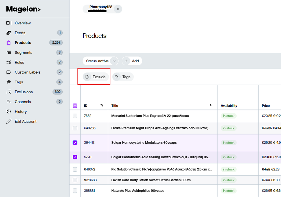 Having to deal with many products, one of the key features for you is to be able to exclude some of the products when needed, without changing your feed over and over again. Magelon gives you the ability to do that through an easy web interface with just a few clicks.