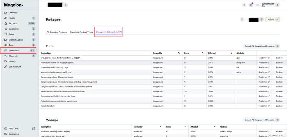 To access this, go to the Exclusions section from the left-side menu, then navigate to the Disapproved (Google MCA) tab. Here, you'll find a list of all disapproval reasons, along with the number of items disapproved for each reason.