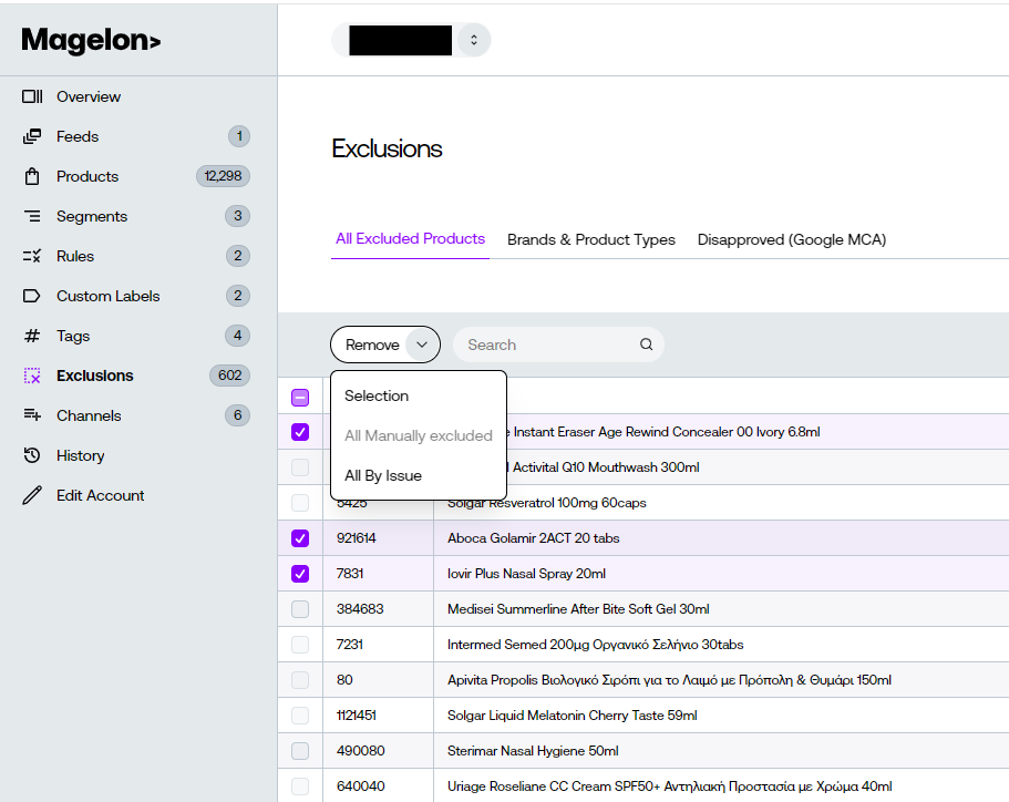 To remove from exclusions the products that are excluded manually you simply select them and click on the Remove button above the table. The drop down list with open and you can select Selection to exclude the selected products or you can select All Manually excluded to remove all the products that are manually exclude, at once. a