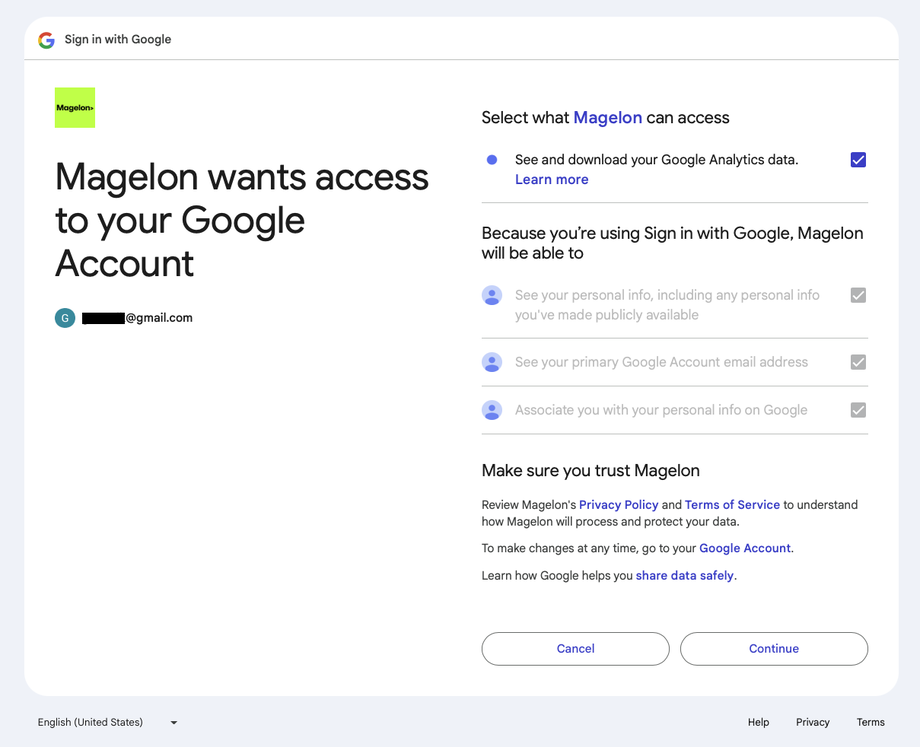 Sign in with the Google account that already has access to the merchant's Google Analytics 4. After signing in, you need to grant Magelon access to your Google Analytics data. To do this, make sure the checkbox "See and download your Google Analytics data" is selected, as shown in the image below. Then, click Continue to proceed.