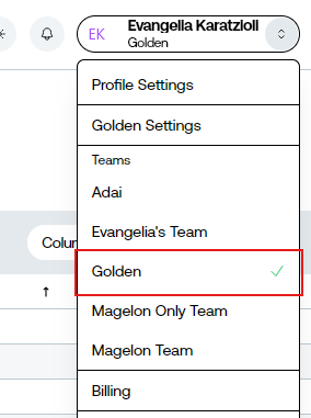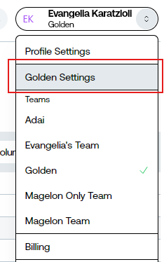 First, ensure you’ve selected the correct team from the profile drop-down menu in the upper right corner of your screen. Then, navigate to the team’s settings. For example, if the team is named "Golden," you would select Golden Settings.