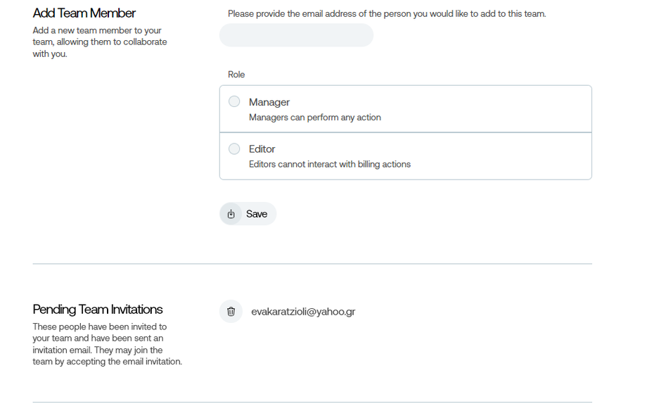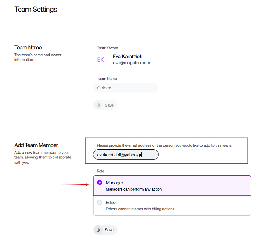 In the team settings, you’ll find the Add Team Member section. Enter the new member’s email and assign their role—either as a manager or editor. For more information on roles and permissions, refer to this article.