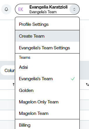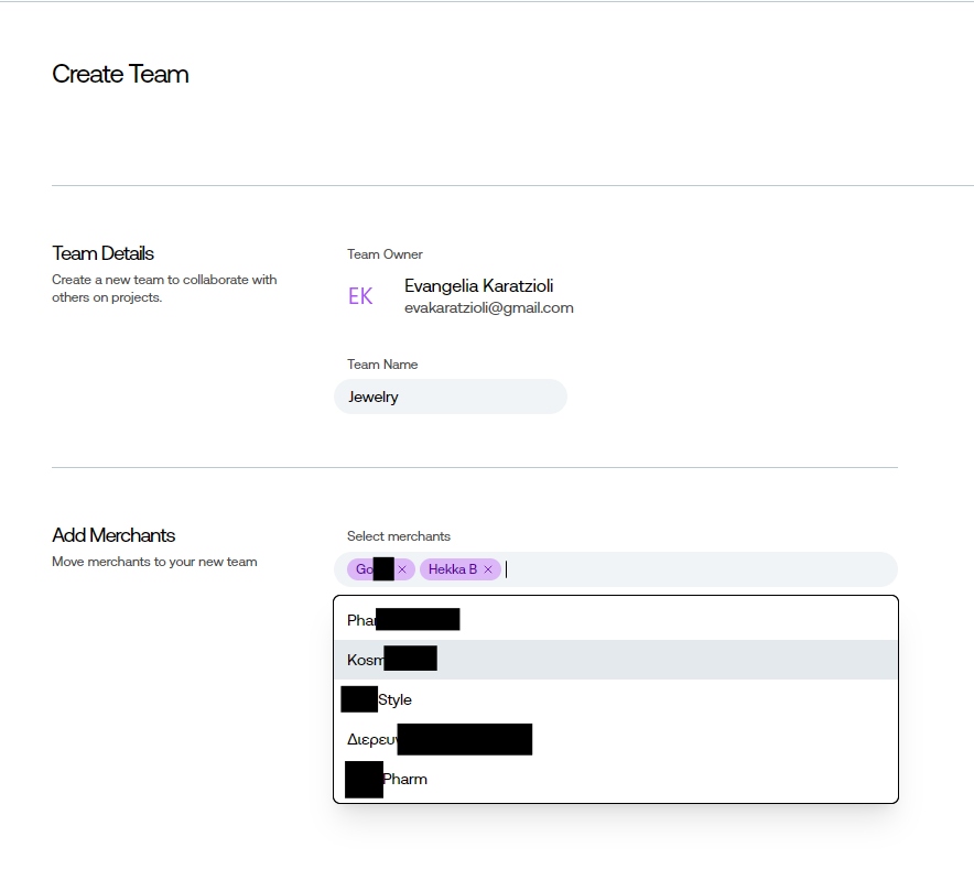 Create a new team To create a new team click to your profile name on the upper right corner of your screen and select Create team. Fill the name you want on the team name and select the merchants you want for this team to have. Click Save, to save the new team.