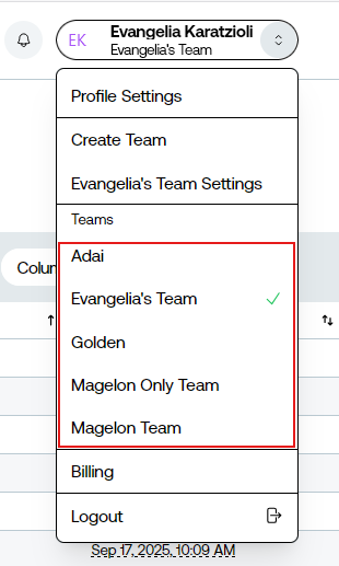 In the drop-down menu under your profile, you will see a list of all the teams you belong to. Each team has its own set of projects, so being part of more than one team allows you to access different projects within each team. This means that you will see different projects on the Dashboard view. To switch between teams, simply click on the desired team name. The green check mark next to a team name indicates which team is currently active in your view.