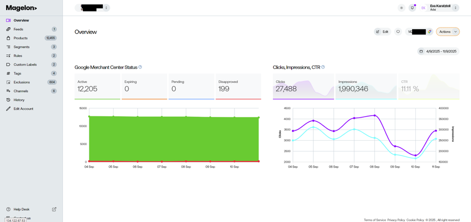 On Google Merchant Center Status you can see the number of products that are active, expiring, pending and disapproved in your merchant center account. Right below this graph you can see the number of the active excluded and deleted products in Magelon Feeds. Using these two graphs can cross check your products on both platforms.